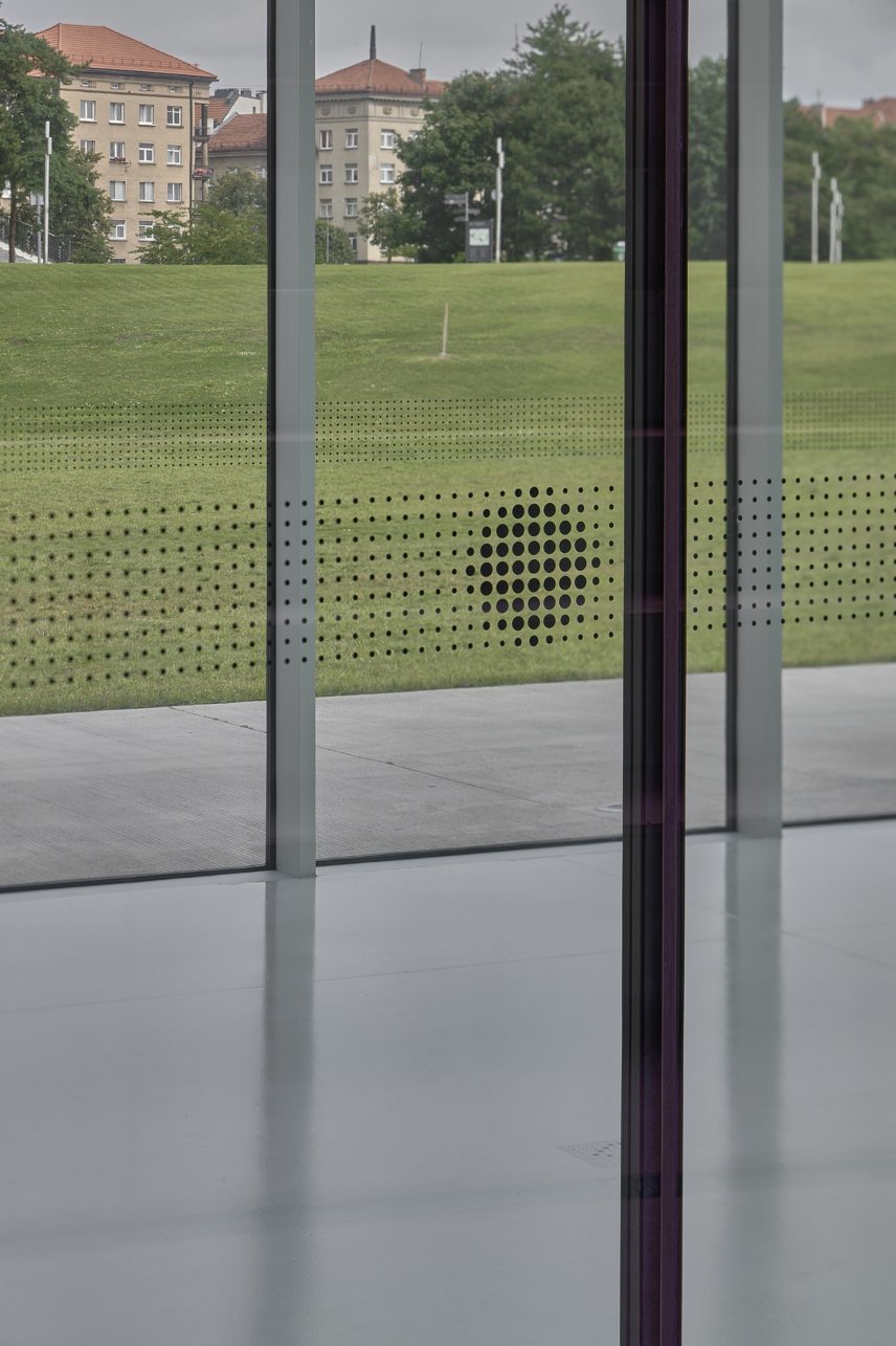Būtent tą fasado raštą pavertėme identiteto dalimi – sukūrėme vientisą juostą, kuri klijuojama ant stiklinių pastato vitrinų. Ji atlieka ne tik funkcinį, bet ir simbolinį vaidmenį. Juokaujame, kad tai galbūt ilgiausias logotipas pasaulyje – jis tęsiasi aplink visą pastato perimetrą.
