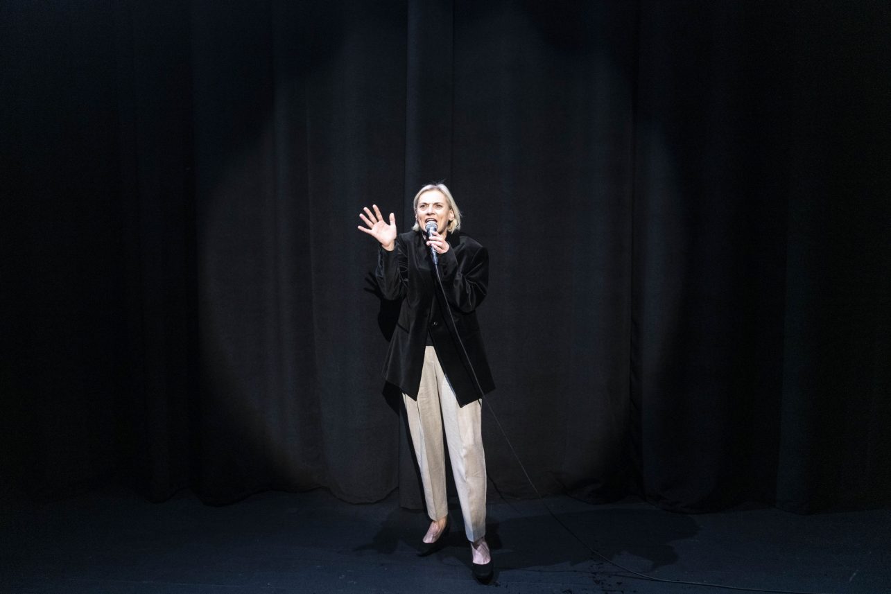 „Stand-up’as prasmei ir beprasmybei“ – komiška pjesė apie pagrindinių veikėjų (Mamos, garsios televizijos laidų vedėjos, ir Sūnaus, jaunojo stand-up žanro komiko) bandymą susikalbėti po tėvo netekties. Juodasis humoras, saviironija ir pasakojamasis humoras (stand-up) derinami su drama, supinant pasakojimą apie praradimą, apie mamos ir sūnaus santykį su visuomenės požiūriu į gedulą ir iš to kylantį poreikį prisitaikyti.