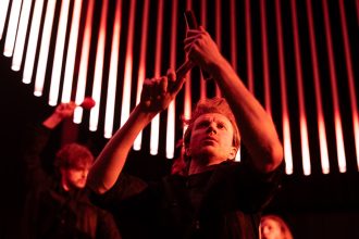 Miglė Munderzbakaitė: Aš manau, kad šio spektaklio atveju yra svarbu ir tai, kad nepaisant dėmesio dar teatrui mažai pažintai DI technologijai, kurios funkciją ir reikšmę jau visi aptarėte, vizualiai scenografijoje spektaklis nėra perkrautas kitais technologiniais efektais, nors galimybės tai tikrai leistų, bet čia to nesiekiama. Spektaklyje dėmesys gana tradiciškai sutelkiamas į tekstą, tiesa sugeneruotą DI, taip tarsi simboliškai gręžiamasi į teatro istoriją, kuomet tekstas ir dramaturgo pozicija buvo dominuojanti. O aktoriams paliekama erdvės.