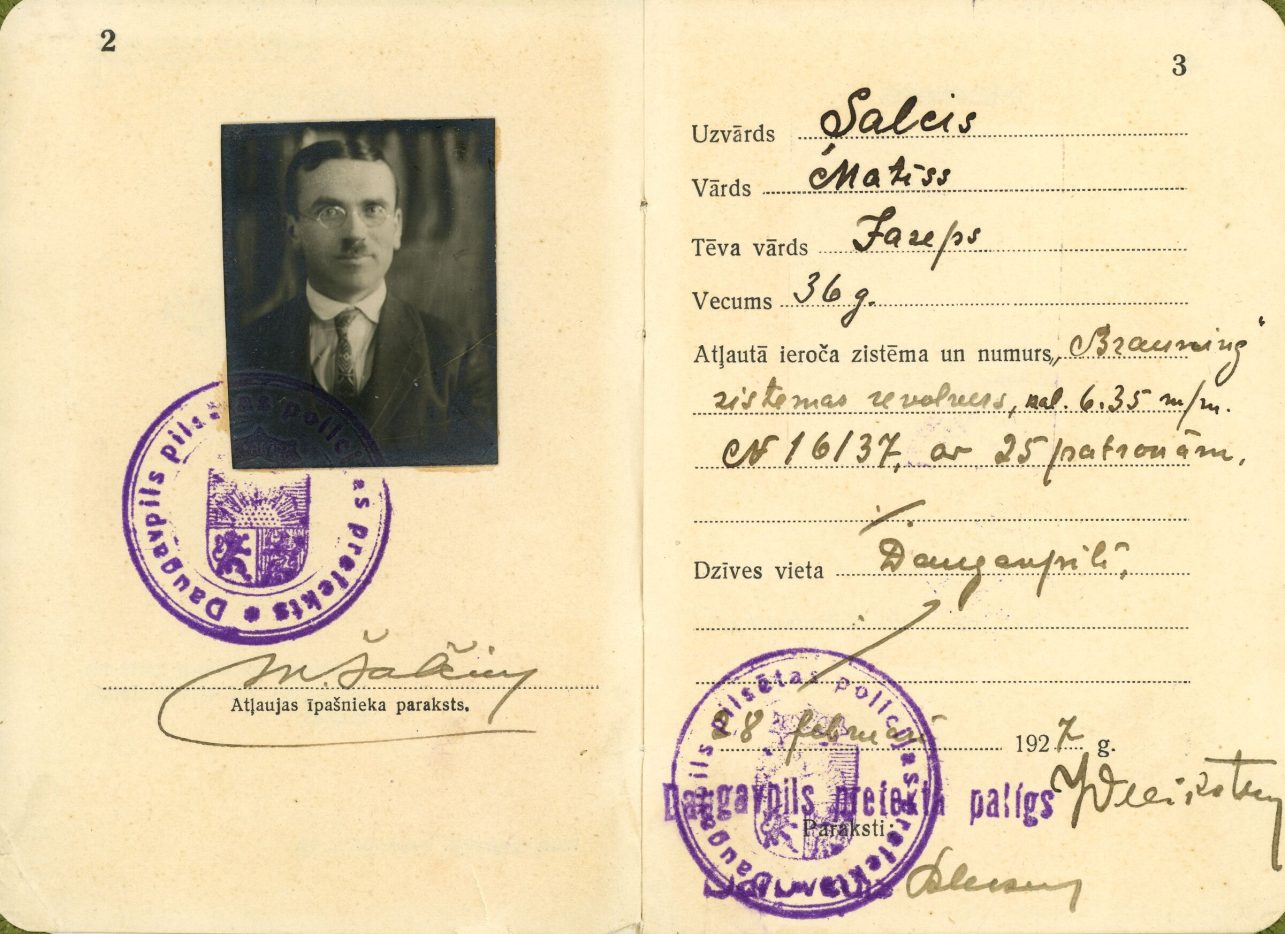 Lapas iš Mato Šalčiaus leidimo nešioti ginklą, suteikto Daugpilio policijos. M. Šalčius atašė prie vicekonsulo Daugpilyje pareigas ėjo nuo 1926 m. rugsėjo 6 d. iki 1927 m. gegužės. 1927 m.