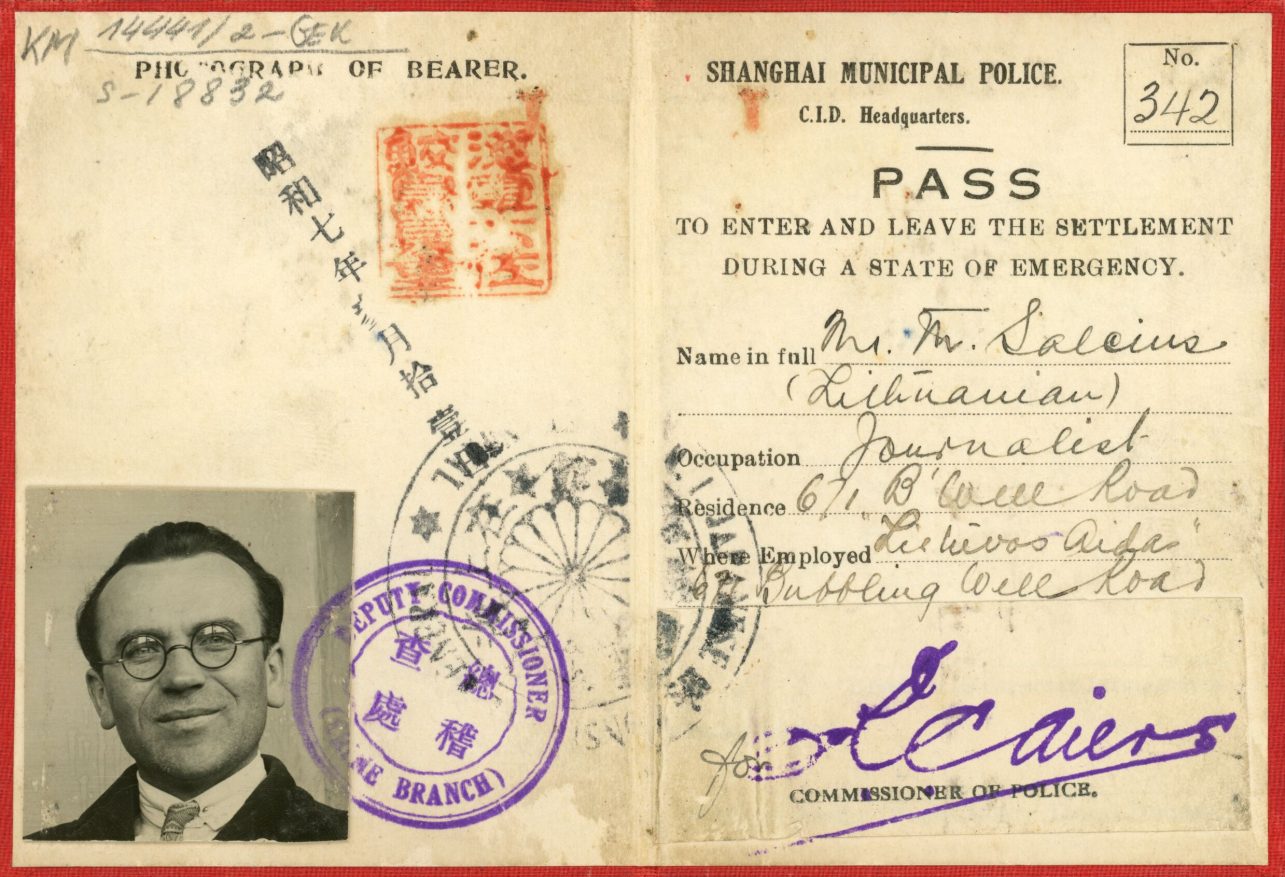 Mato Šalčiaus atvykimo ir išvykimo iš gyvenvietės ekstremalios situacijos metu užsienio pasas. XX a. 4 deš. išduotas Šanchajaus policijos