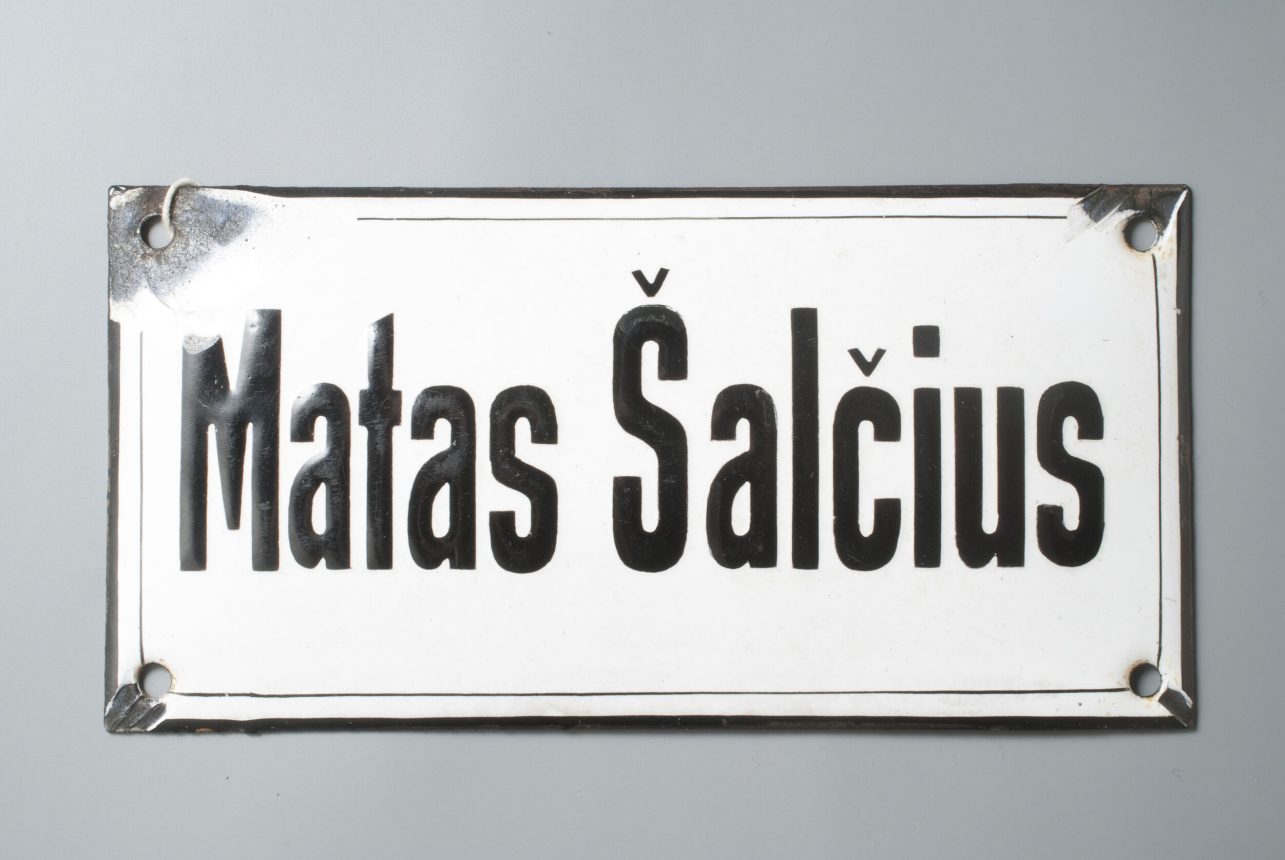 Metalinė durų lentelė su užrašu „Matas Šalčius“. XX a. IV deš.