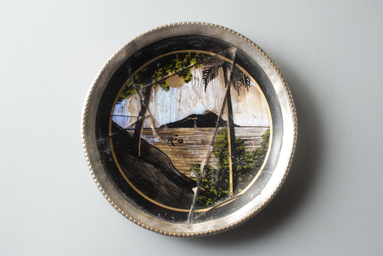 Suvenyrinė lėkštelė puošta peizažu, atliktu tradicine Brazilijoje naudota technika, kai apart dažų puošyboje yra naudojami tropinių drugių Morfų (Morpho) sparneliai. XX a. I p.