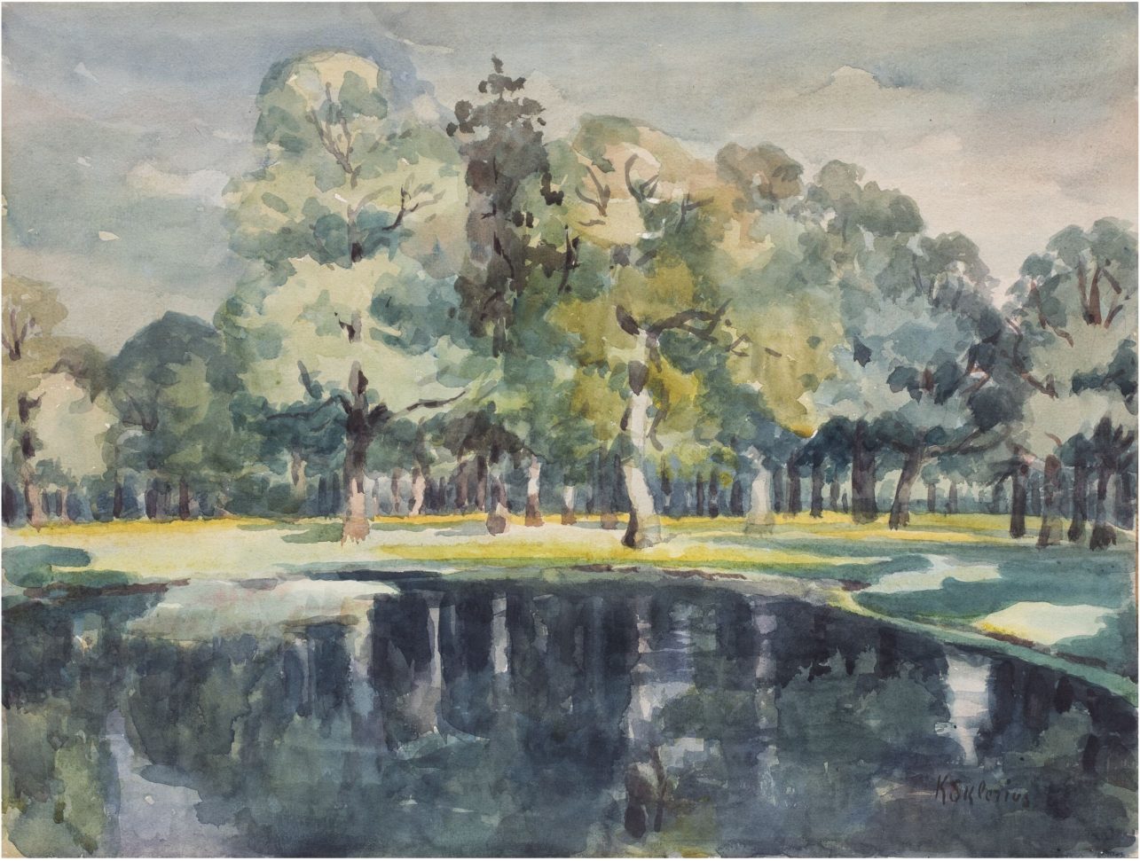 Ąžuolynas, 1923–1925 m. Akvarelė. Autorius: Kajetonas Sklėrius (Nacionalinis M. K. Čiurlionio dailės muziejus)