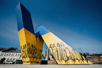 Belgiškas totemas Kaune nusidažė Ukrainos spalvomis