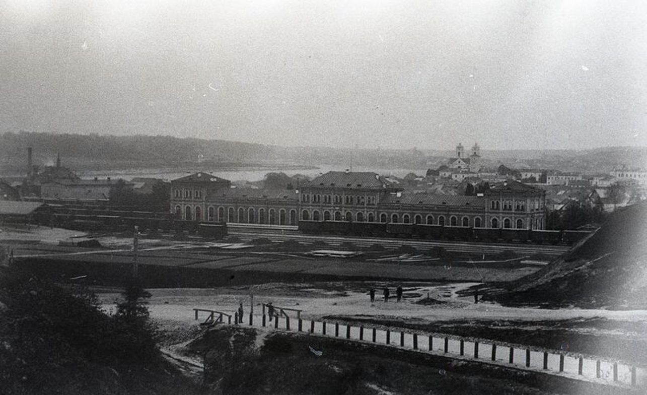 1863 m. atidaryti Kauno geležinkelio stoties rūmai nuo Šančių pusės. 1885–1895 m. Autorius Vaclovas Zatorskis. Stanislovo Lukošiaus reprodukcija. Kauno miesto muziejus