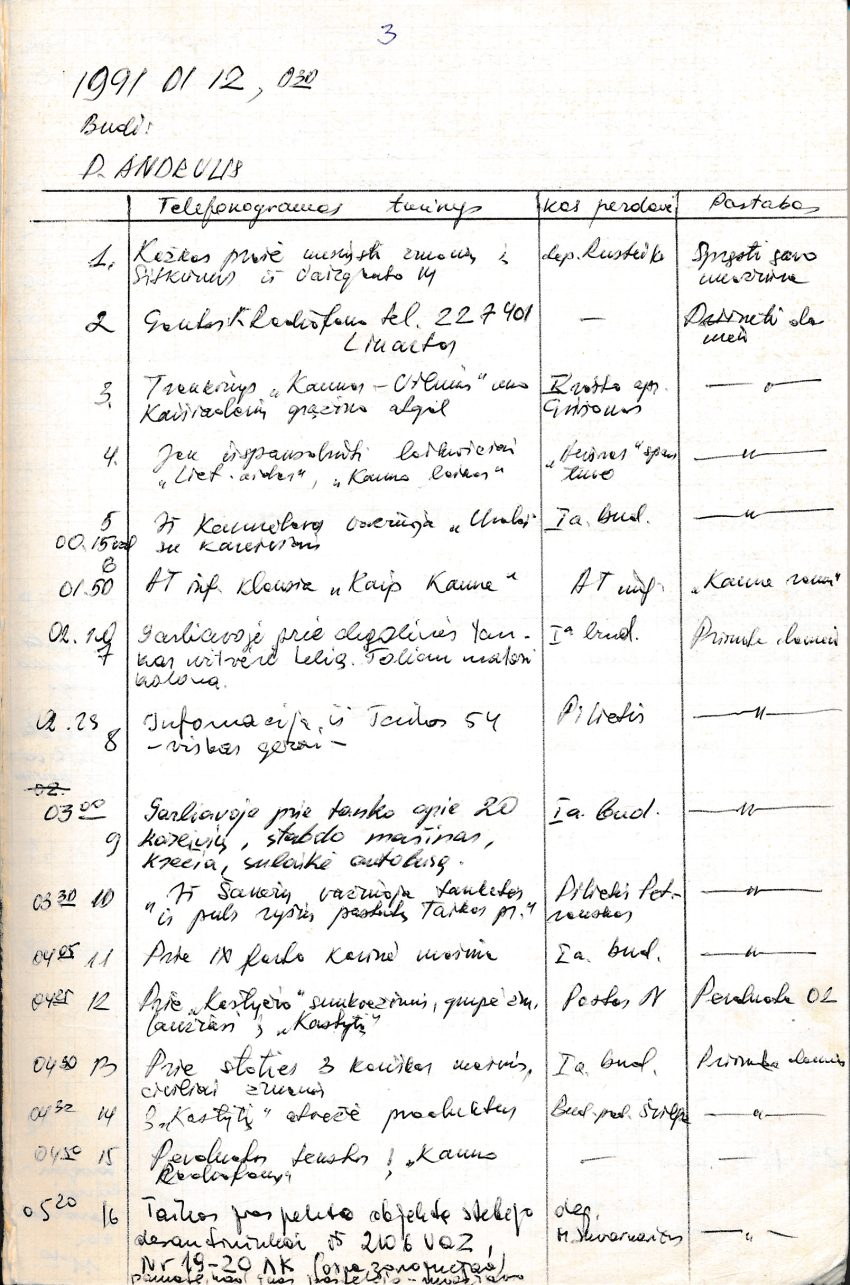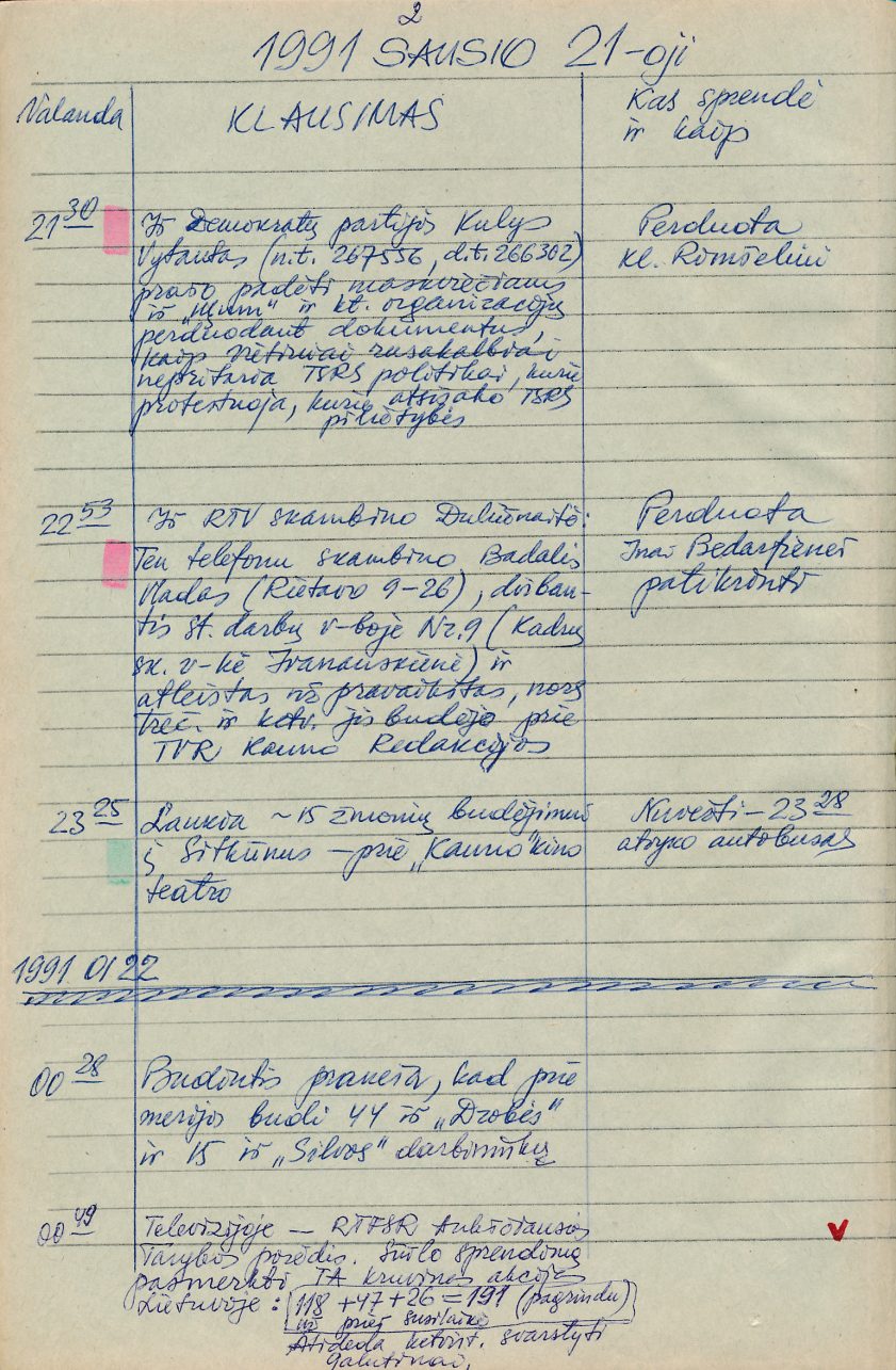 Lentelėse buvo žymimas svarbesnių skambučių laikas, paskambinusio vardas (jei prisistatė), pokalbio esmė ir tai, kur toliau buvo perduota ar kaip panaudota informacija. Labiausiai kritiškomis paromis sąsiuviniuose buvo konspektuojamos ir reikšmingesnės per Lietuvos radiją ir televiziją paskelbtos skubios naujienos. Tomis dienomis „visame pastate pastebimai pagausėjo patamsėjusiais paakiais, paraudusiomis nuo nemigos akimis veidų. Daugelį vyriškių aplinkybės privertė auginti barzdas. […] Savivaldybėje netyla skambučiai žmonių, siūlančių įvairią pagalbą. Atsiliepė daug gydytojų, transportininkų, kitų profesijų darbuotojų, įvairių kolektyvų atstovų“, rašoma „Laisvojo Kauno“ puslapiuose (1991 01 17, nr. 4, p. 3). Į šį leidinį laikinai, nuo sausio 14 d., buvo apsijungusios „Kauno tiesos“, „Kauno laiko“ ir „Tėviškės žinių“ redakcijos. Žmonės skambino, siūlydami savo pagalbą ir dalydamiesi aktualia informacija ne tik savivaldybei, bet ir „Laisvojo Kauno“ redakcijos priimamajam bei televizijos Kauno studijai. Daug skambučių sulaukdavo ir miesto tarybos organizuotas medicinos pagalbos štabas bei psichologinė tarnyba.