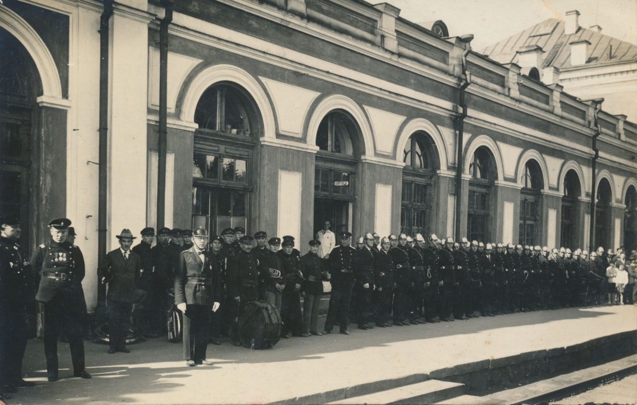 Geležinkelio stoties perone išsirikiavę ugniagesiai. Apie 1930 m. Kauno miesto muziejaus fondai