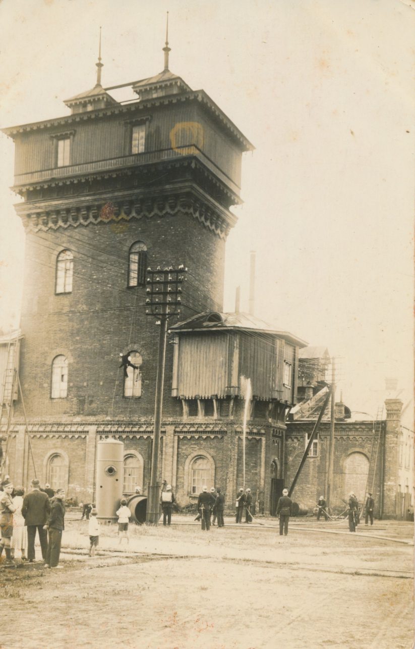 Kaip tik tokį, aprašymui identišką vaizdą regime V. Juzėno rinkinio nuotraukoje, kurioje ugniagesys leidžiasi virve iš vandens bokšto trečio aukšto lango. Dešiniau ant medinės sienos liejamas vanduo, pumpuojamas rankiniu siurbliu, ir stovi kopėčios. Dar vienos aukštos, sustumiamos kopėčios, atremtos į sieną iki pat stogo, matomos nuotraukos kairėje. Vertas dėmesio pats, iki šių dienų neišlikusio (1944 m. besitraukiančių vokiečių susprogdinto) vandens bokšto vaizdas: viršutinis medinis aukštas dekoruotas drožiniais, virš jo kyšo du simpatiški bokšteliai.