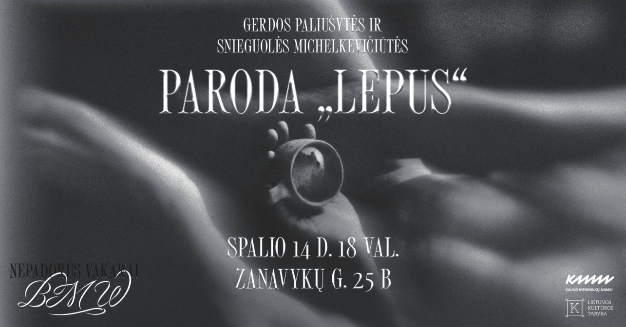 Kauno menininkų namų programoje „Nepadorūs vakarai. BMW“ – dviejų menininkių, Snieguolės Michelkevičiūtės ir Gerdos Paliušytės, parodos 𝐿𝑒𝑝𝑢𝑠 atidarymas netikėtoje erdvėje. Labai arti Žaliakalnio turgaus esanti erdvė – kažkada buvusio aktyvaus miesto turgaus dalis. Šiuo metu gali atrodyti, kad turgus ir jo apylinkės išgyvena tam tikrą tranziciją, štilį, bet ir toliau išlaiko bendruomenės susitikimų vietos funkciją, kuri labai svarbi ir šios parodos kontekste.