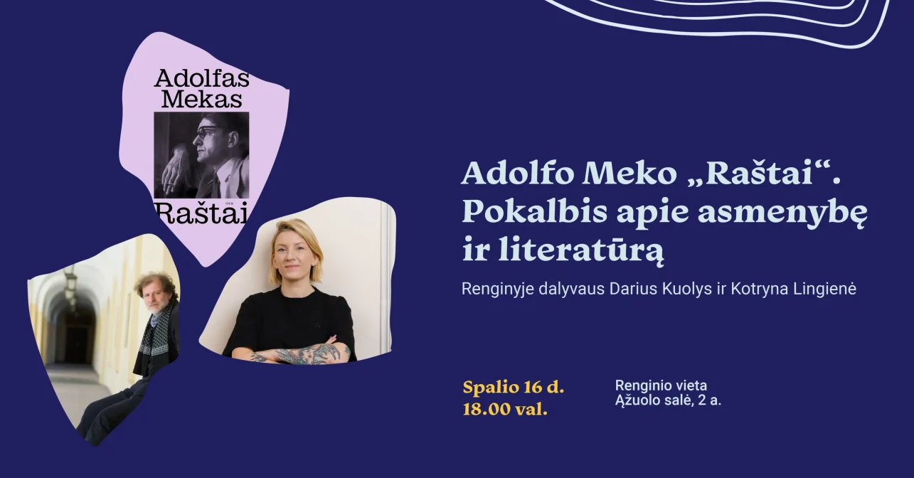 Adolfas Mekas (1925–2011) – rašytojas, aktorius, pasaulinio pripažinimo sulaukęs alternatyvaus kino režisierius. Pirmąkart Lietuvoje išleistuose A. Meko „Raštuose“ skelbiamas įspūdingas menininko dienoraštis ir išlikę prozos kūriniai. Pristatymo vakaras – su literatūros istoriku, VU docentu dr. Dariumi Kuoliu ir kultūros žurnaliste Kotryna Lingiene.