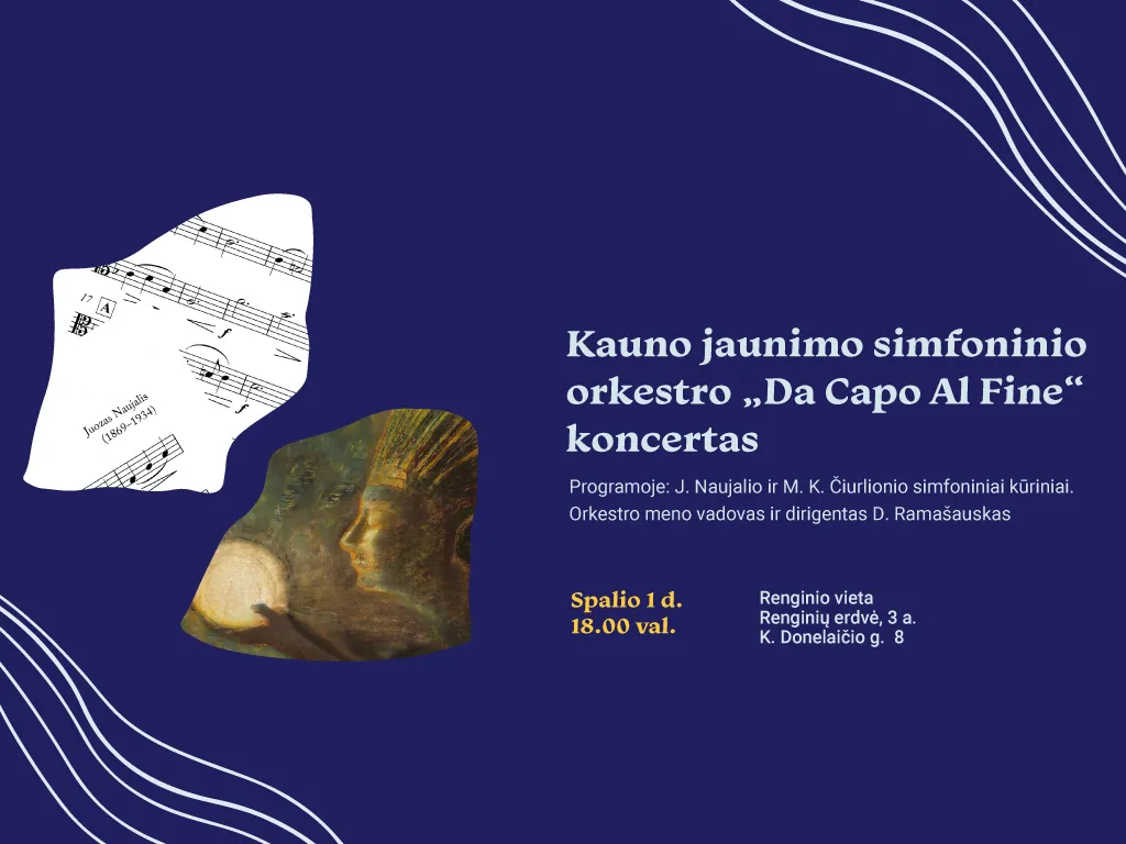 Kauno jaunimo simfoninio orkestro „Da Capo Al Fine“ koncertas skirtas Juozo Naujalio 156-osioms ir Mikalojaus Konstantino Čiurlionio 150-osioms gimimo metinėms pažymėti. Orkestro meno vadovas ir dirigentas – Domininkas Ramašauskas.