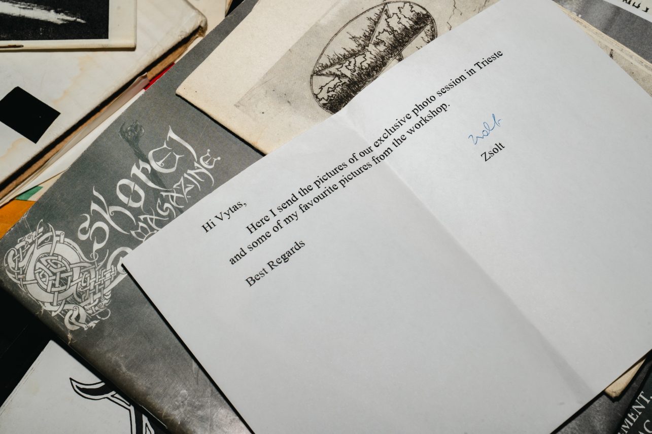 Šio susitikimo mintis gimė prisiminus Vyto pasakojimą kitame interviu apie tai, kad anuomet susirašinėjo su gana žinomomis įrašų kompanijomis. Tuo įsitikinu rankose laikydamas „Misanthropy Records“ įkūrėjos laiškus, skrajutes ir originalius to meto artefaktus su dviejų (bene žymiausių) žanro grupių logotipais – „Burzum“ ir „Mayhem“.