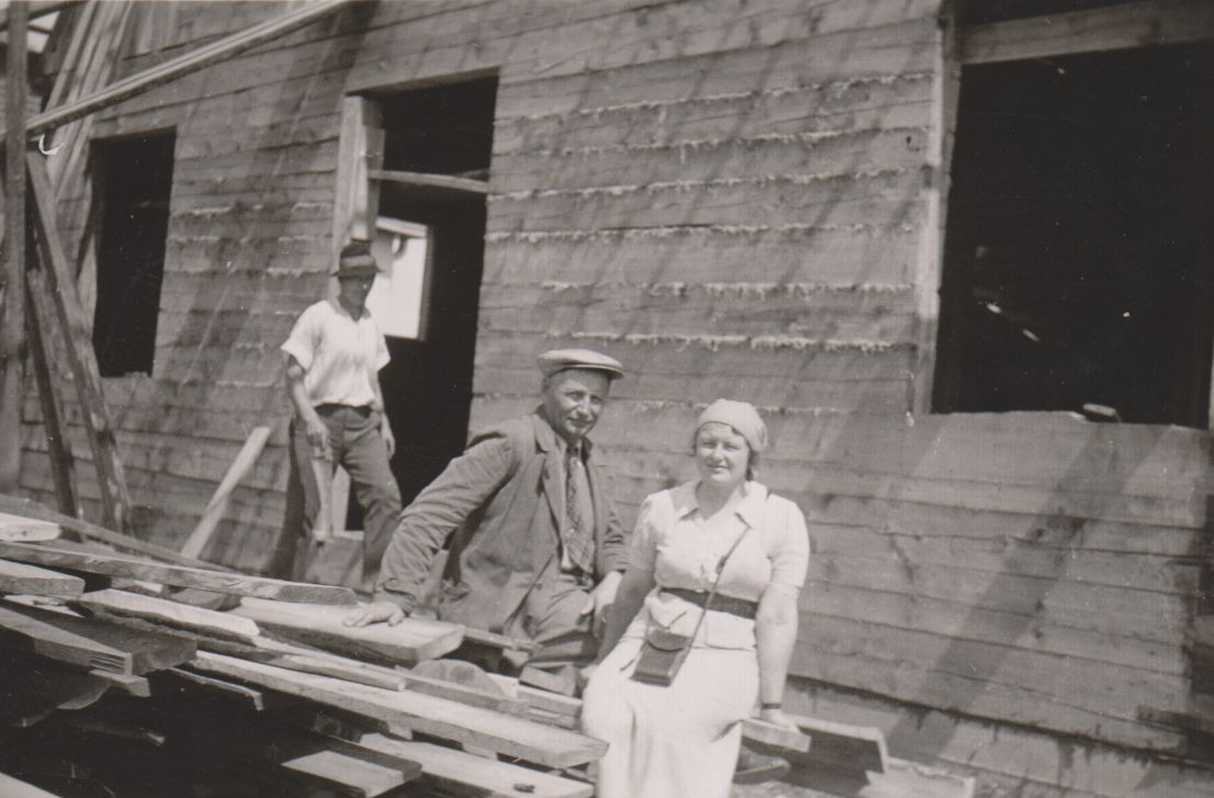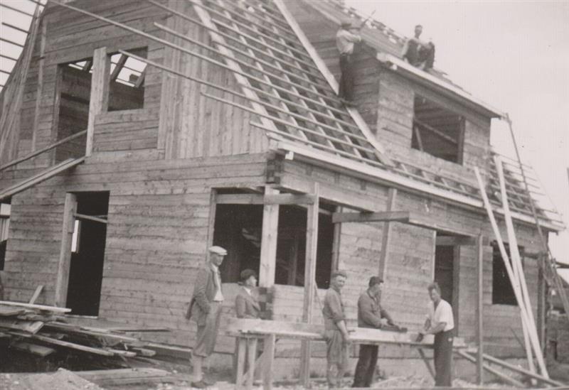Įdomu tai, kad namas iš pradžių buvo pastatytas ne čia, o Žemaitijoje, dabartiniame Mažeikių r. Rąstus ir medieną statybai padovanojo B. Sruogos uošvis, aristokratiškos giminės palikuonis Kazimieras Daugirdas. Jo dvare buvo suręstas pastato karkasas, kitų metų pavasarį išardytas ir traukiniu atvežtas į Kauną. Yra išlikęs ir siuntimo važtaraštis, kuriame pažymėtas krovinys – išardytos trobos dalys. Su pakuote svėrė beveik 15 tonų! Į Kauną atvyko dvaro darbininkai ir per porą vasaros mėnesių namą pastatė galutinai. B. Sruoga su kaimynu juokavo, kad statybos darbai – viena geriausių sporto rūšių. Artimo rašytojo bičiulio ekonomisto Albino Rimkos dukra Elena Rimkaitė, tuo metu 13 metų mergaitė, štai kokį įspūdį susidarė apie statybų procesą: „Vanda su Dalia kapstydavosi darželyje. O Balys vinis kalinėdavo. Dešinėj rankoj plaktukas, o už diržo užkištos vinys. Viena vinis už kairės ausies. Mus pamatęs, sakydavo: „Palaukit, tiktai vinį įkalsiu“. Ir, būdavo, įkala vinį į namo sieną ar tvorą. O Vanda iš tolo šaukdavo: „Ką tu ten kalinėji be jokio reikalo!“ Pasisveikinęs Balys išrūkydavo pypkę, ir tuo metu mes pasišnekėdavom. Ilgiau netrukdydavom. Balys visada truputį palydėdavo, bet prieš tai būtinai įkaldavo dar vieną vinį.“