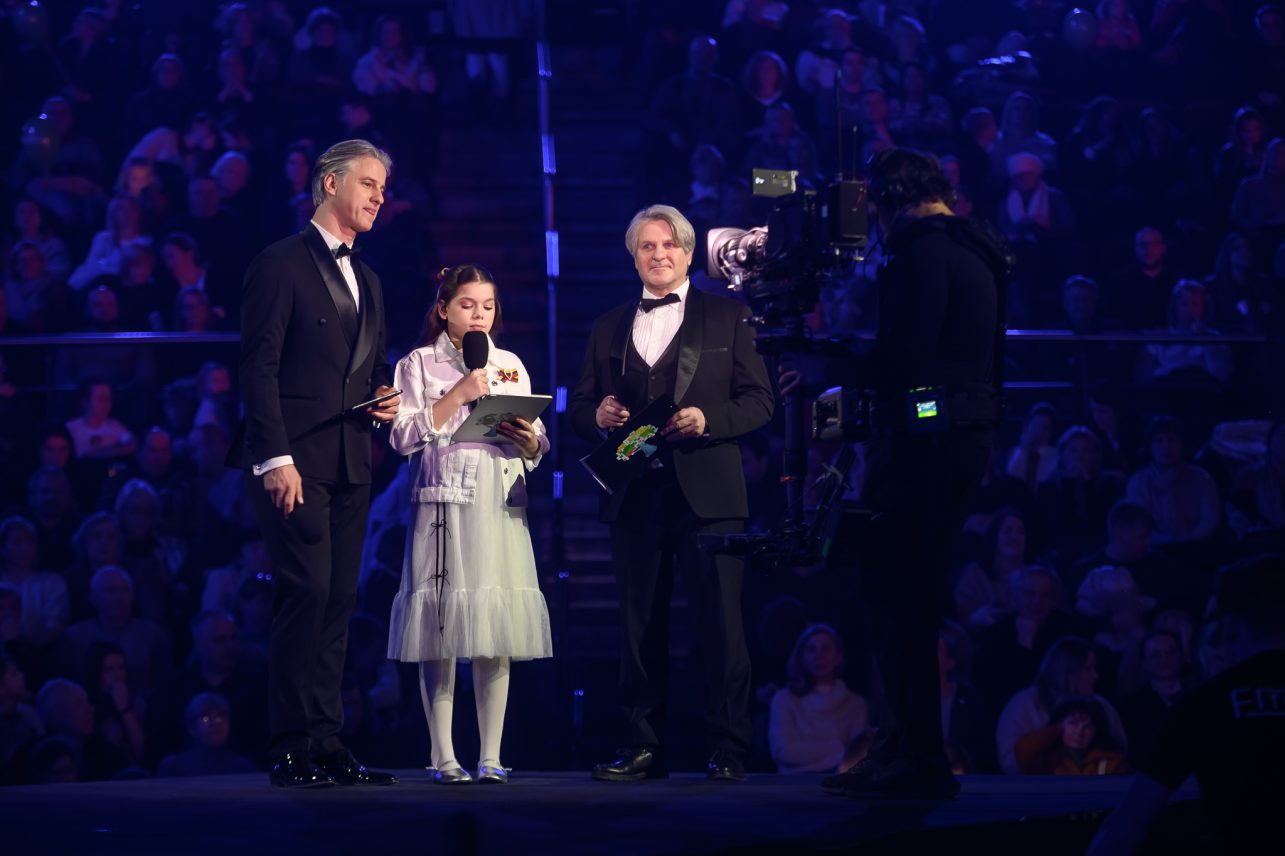Aktoriai Andrius Bialobžeskis ir Vytautas Rumšas jaunesnysis bei moksleivė Lėja