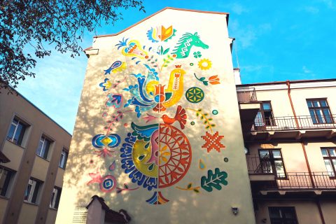Ant muziejaus fasado – miesto, kvartalo ir pastato istoriją primenantys piešiniai